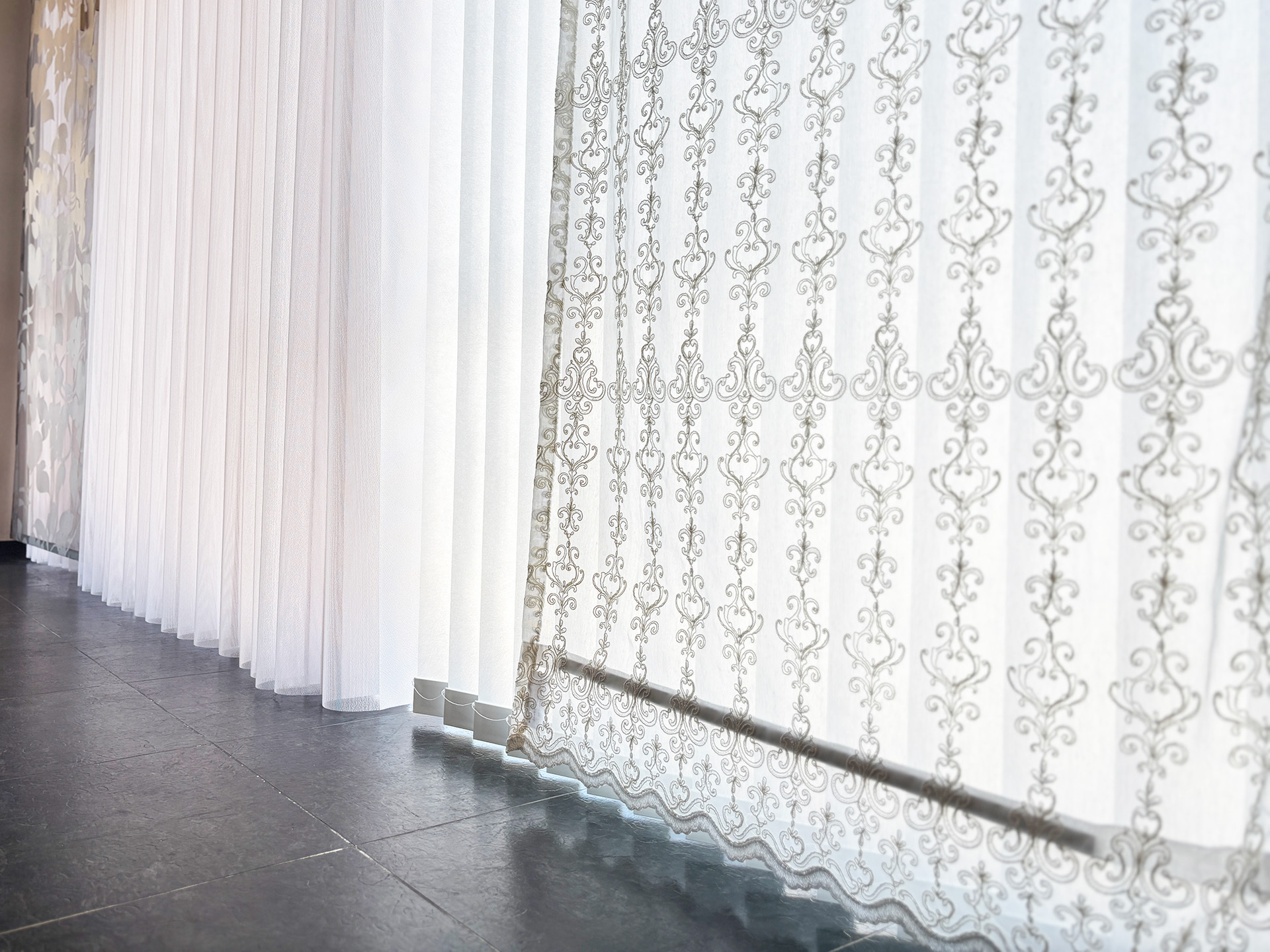 刺繍が施されたクラシカルなデザイン調のレースカーテンです。